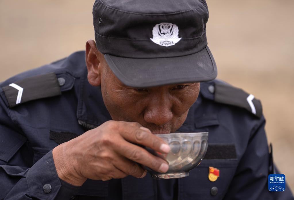 6月2日,午餐時間,石角在喝酥油茶。新華社記者 費茂華 攝