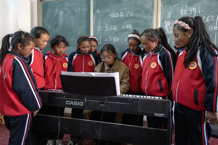 鋼琴課教室里又響起了歡快的樂(lè)曲聲,那是巴桑老師在教旦增吉宗和她的小伙伴們一首當(dāng)?shù)馗枨段业募以谌湛t》:“你的家在哪里,就在日喀則呀……日喀則是好地方……”