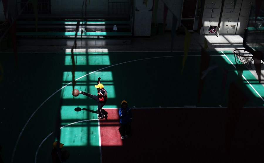 6月5日,扎西宗鄉(xiāng)完全小學(xué)的學(xué)生在室內(nèi)體育館上籃球課。