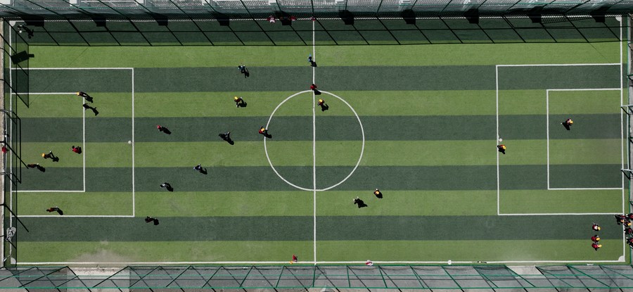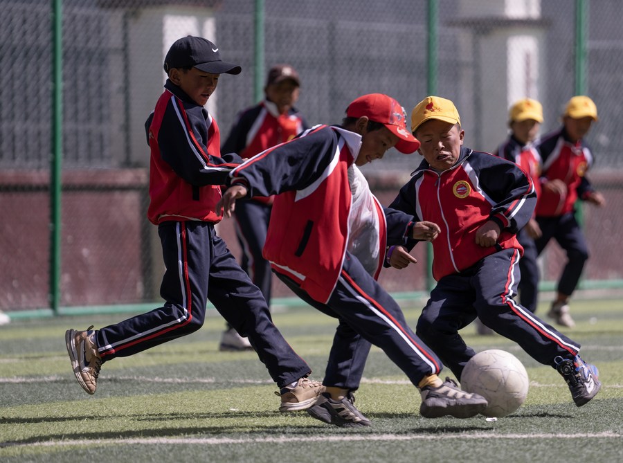 扎西宗鄉(xiāng)完全小學(xué)的學(xué)生在體育課上踢足球(6月5日攝,無(wú)人機(jī)照片)。