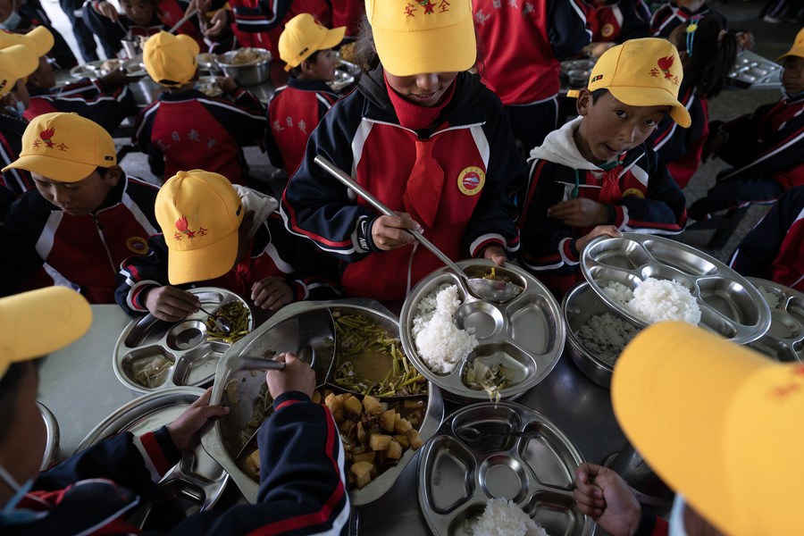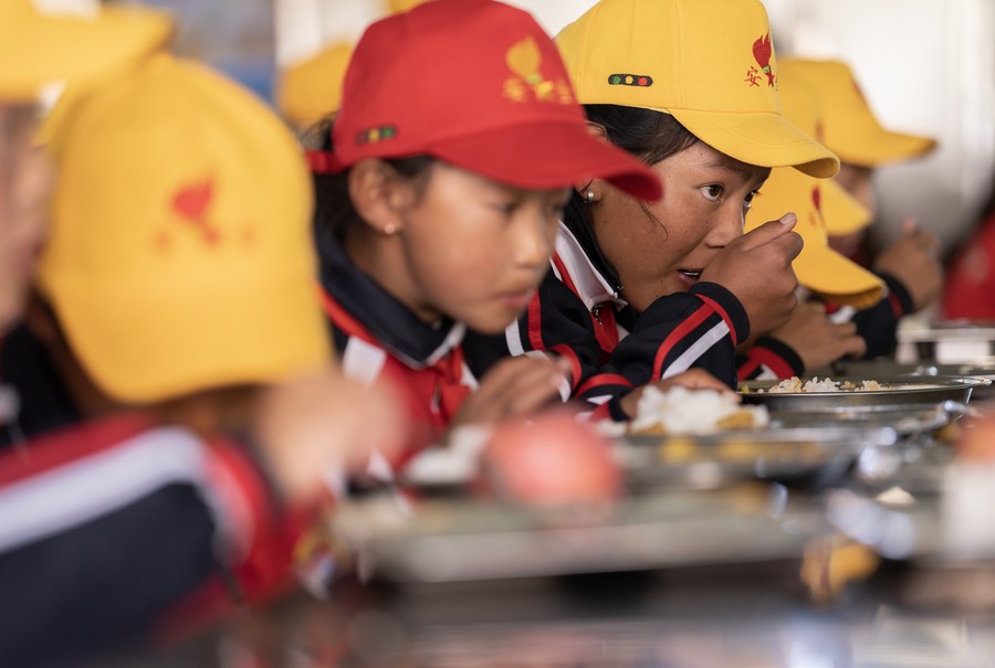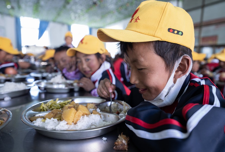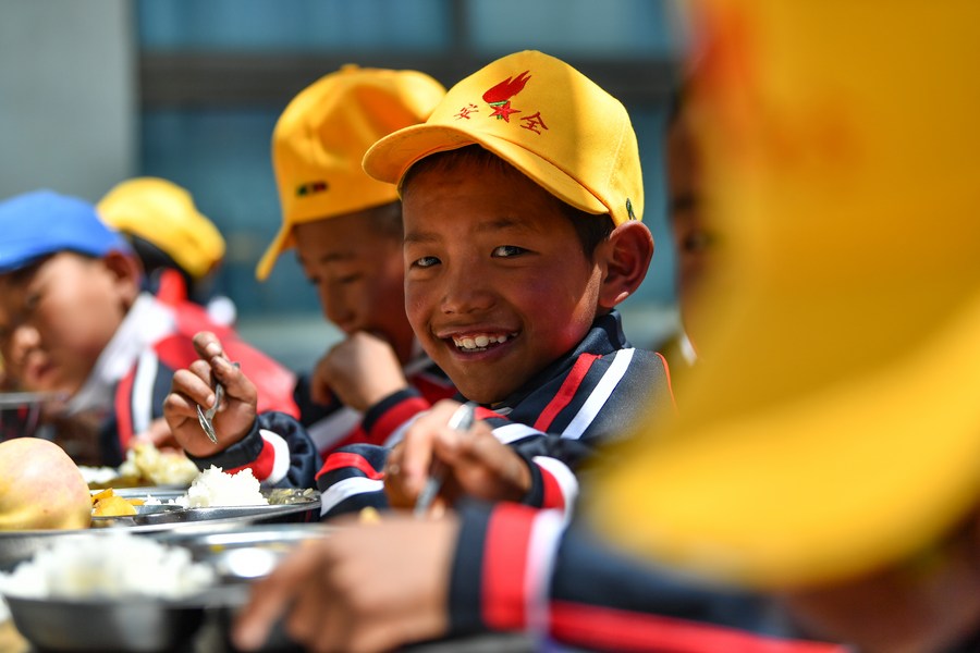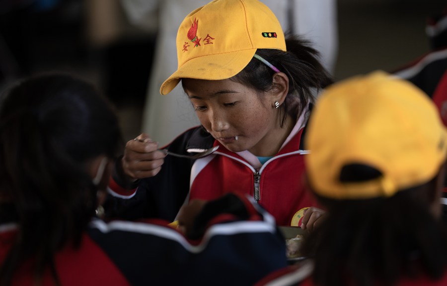 6月5日,扎西宗鄉(xiāng)完全小學(xué)的學(xué)生在食堂吃午飯。