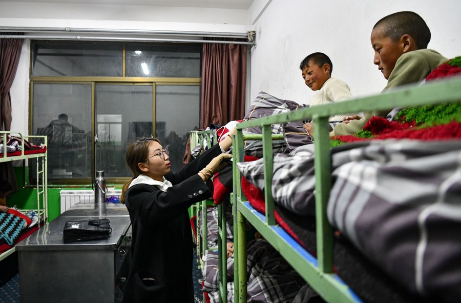 扎西宗鄉(xiāng)完全小學(xué)的值班老師在檢查孩子睡覺(jué)時(shí)是否蓋好被子(6月5日攝)。