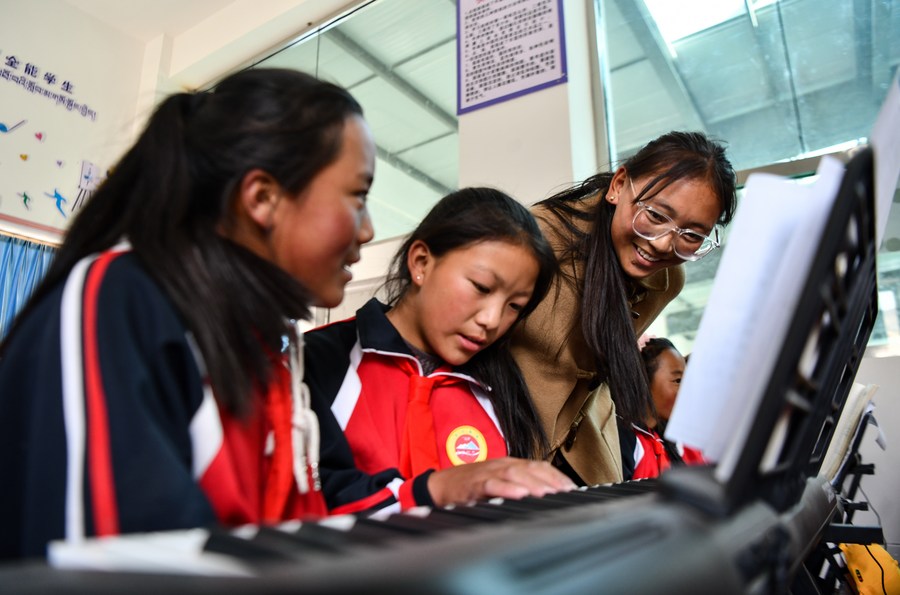 6月5日,扎西宗鄉(xiāng)完全小學(xué)的鋼琴課老師巴桑(右)在給學(xué)生指導(dǎo)指法。