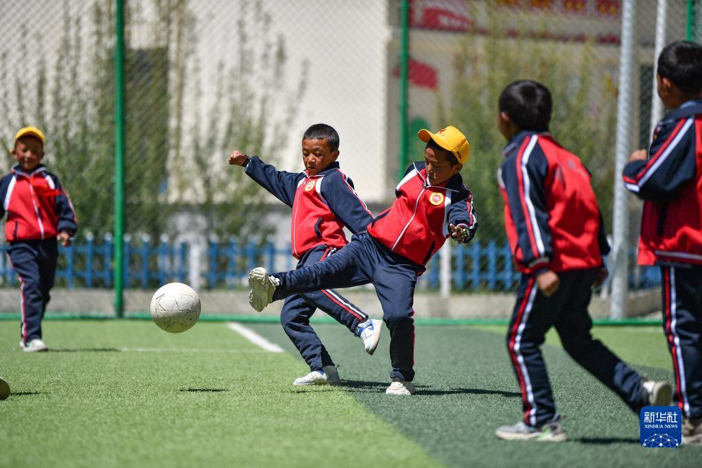 扎西宗鄉(xiāng)完全小學(xué)的學(xué)生在人工草坪上踢足球(6月5日攝)。新華社記者 晉美多吉 攝