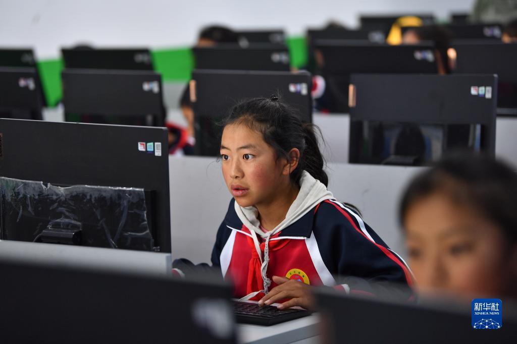 6月5日,拉巴卓瑪老師在給扎西宗鄉(xiāng)完全小學(xué)六年級的學(xué)生上計算機課。新華社記者 費茂華 攝