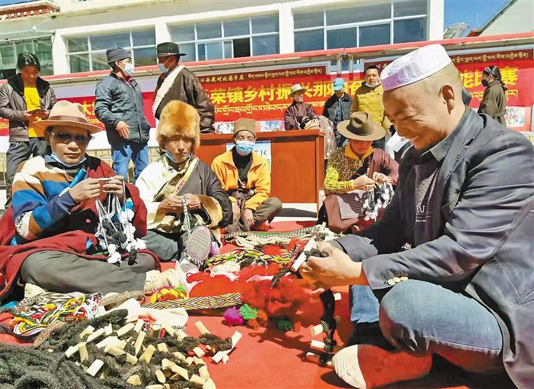 這是在那曲市聶榮縣聶榮鎮(zhèn)“鄉(xiāng)村振興 那曲奮進(jìn)”活動(dòng)中,藏族群眾和回族群眾在交流手工藝品的制作方法。