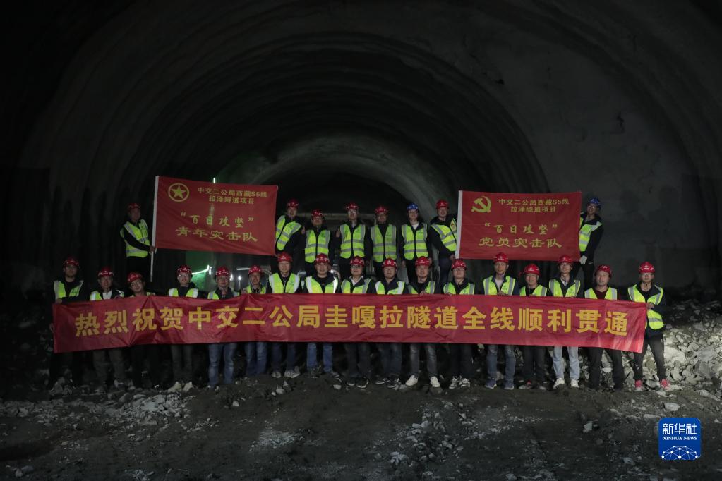6月28日,施工人員在西藏S5線圭嘎拉隧道全線貫通后合影留念。新華社發(fā)(林夢(mèng)月 攝)