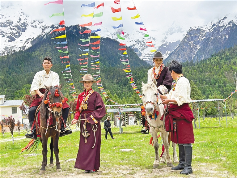 波密縣扎木鎮(zhèn)康木村坐落于318國(guó)道旁,風(fēng)景秀麗,群山環(huán)繞,很多自駕游的游客都會(huì)經(jīng)停于此體驗(yàn)藏家文化。圖為游客在康木村,穿著藏裝體驗(yàn)騎馬樂(lè)趣。 圖片由記者 張猛 攝