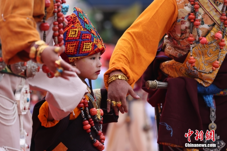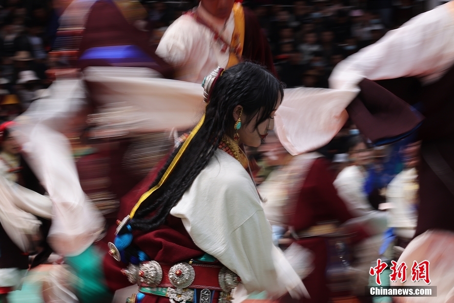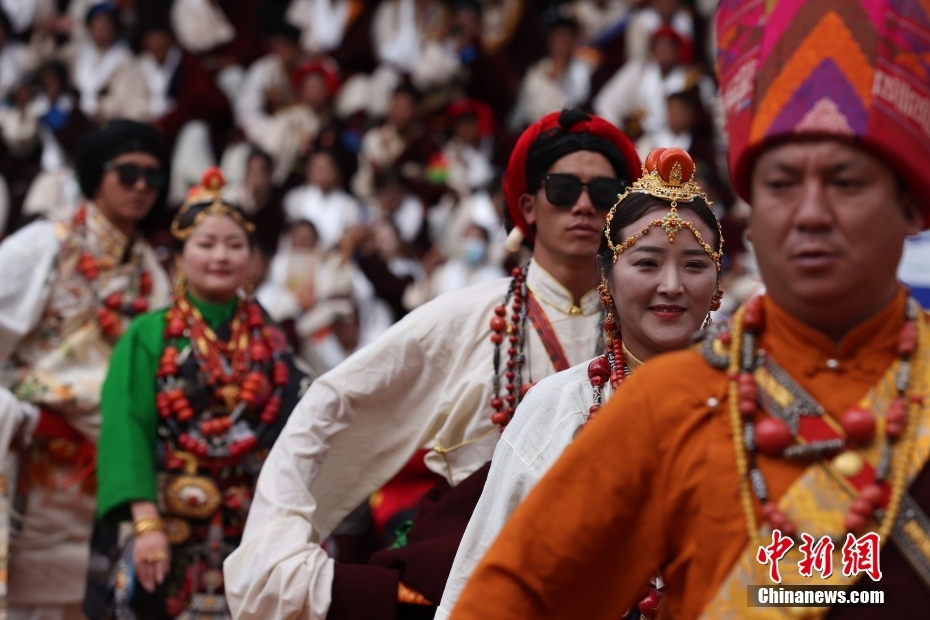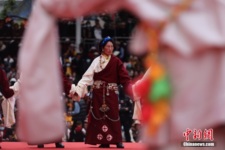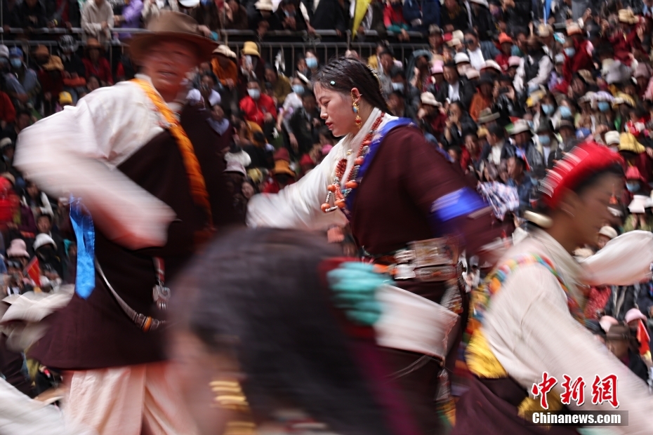 7月17日,西藏自治區(qū)昌都市貢覺縣,民眾身著極具特色的民族服裝服飾,載歌載舞出席當(dāng)?shù)氐奶厣椪够顒印?/p>