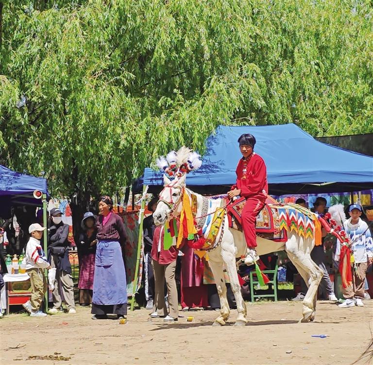 賽場上,幾個稚嫩的小伙子引起了大家的注意。他們熟練地跳上馬背、抓緊韁繩、目光堅定。“哇!太棒了!”“媽媽,那個哥哥拿到了哈達!”……只見16歲的單增阿旺策馬奔騰,俯身拾起地上的綠色哈達,獲得大家的陣陣掌聲?!拔覐男【秃芟矚g騎馬,除了去年因為學業(yè)緊張,沒能參加賽馬表演,往常每年都會參加。”單增阿旺說。