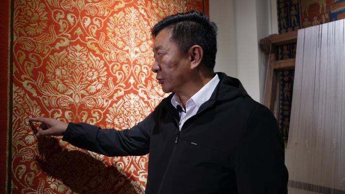 次旦向記者展示藏毯上的明朝圖案。 任帥 攝