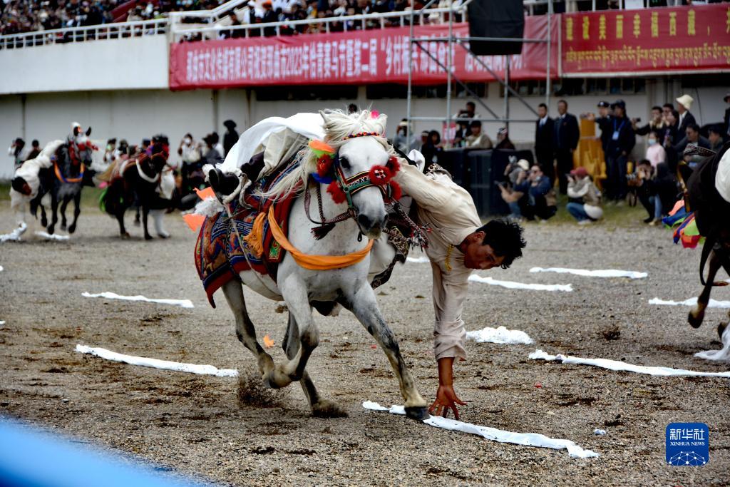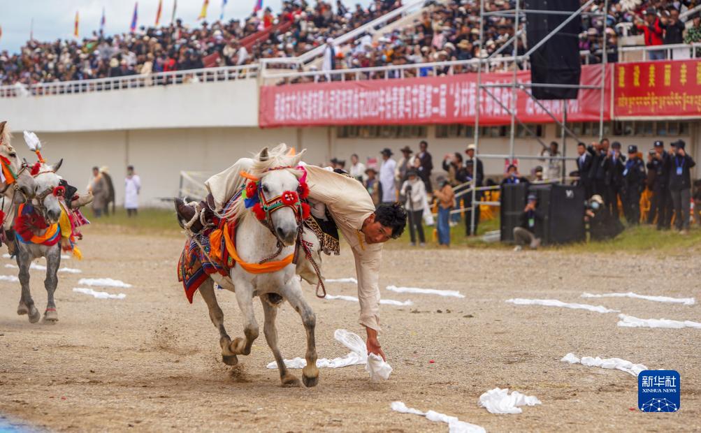 8月10日,騎手表演跑馬拾哈達(dá)。新華社記者 陳澤鵬 攝