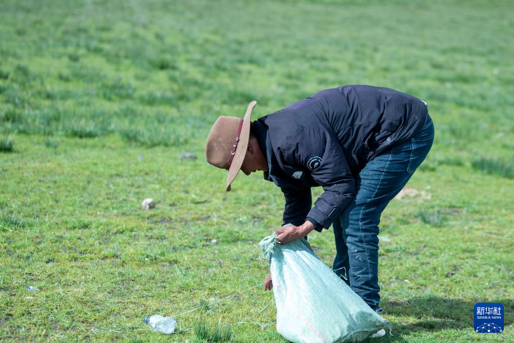 8月11日,次扎達(dá)在轉(zhuǎn)換牧場時撿拾生活垃圾。新華社發(fā)(旦增努布攝)