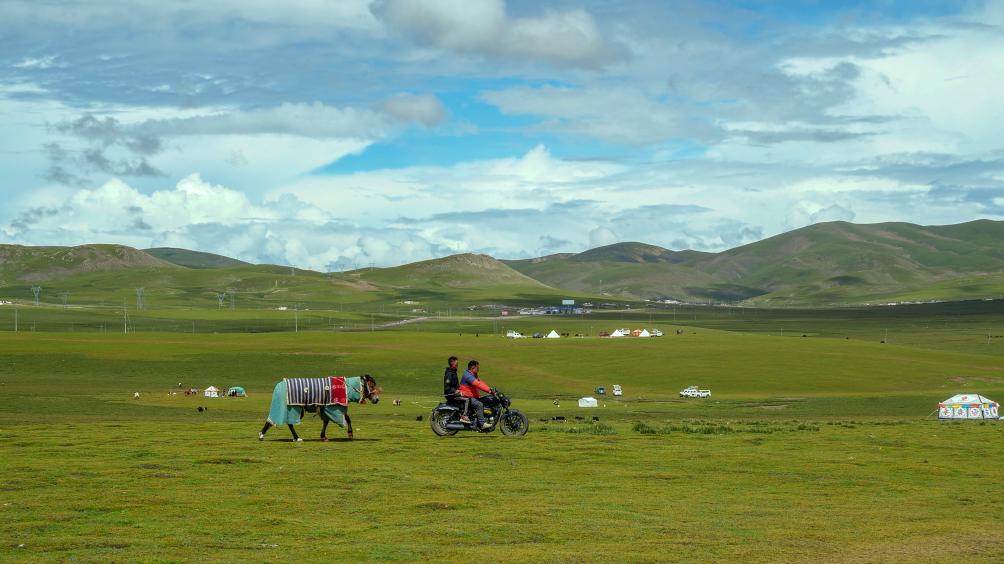 8月11日,馴馬人騎摩托車(chē)在羌塘草原上遛馬。新華社記者 陳澤鵬 攝