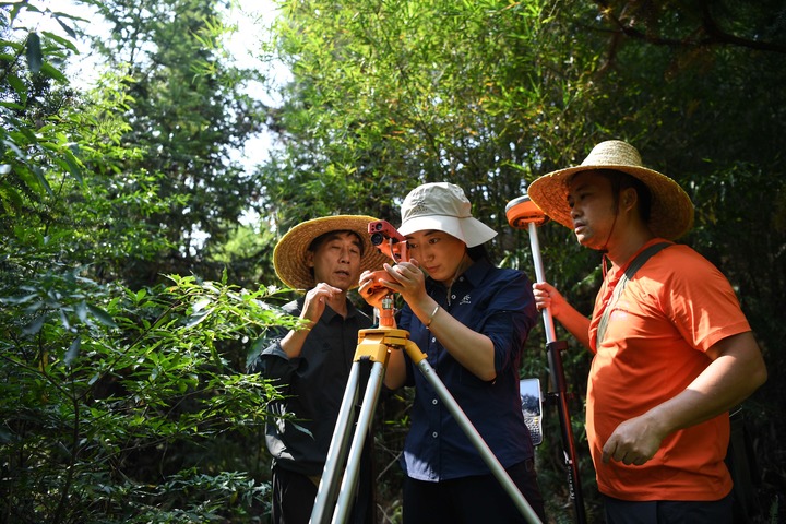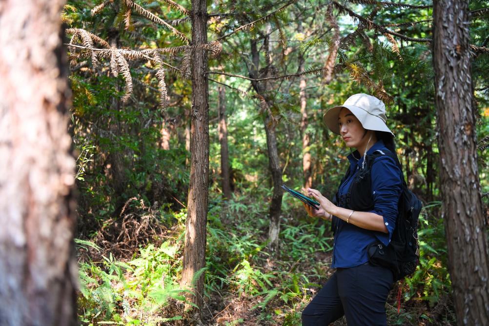 2022年9月22日,白拉曲珍在廣東韶關樂昌市張溪村生態(tài)監(jiān)測樣地工作。新華社記者鄧華 攝
