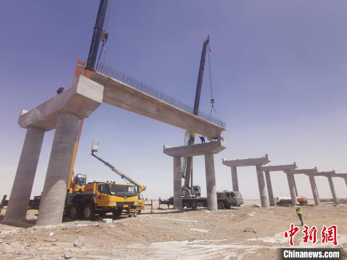 據(jù)介紹,跨青藏鐵路轉體橋梁設計長度687米,分主橋和引橋兩部分,引橋共設計箱梁116片。預制箱梁架設屬于高風險施工,本次架設的首片箱梁設計長度20米,重量55噸,采用兩臺大型汽車吊協(xié)同作業(yè)完成架設。