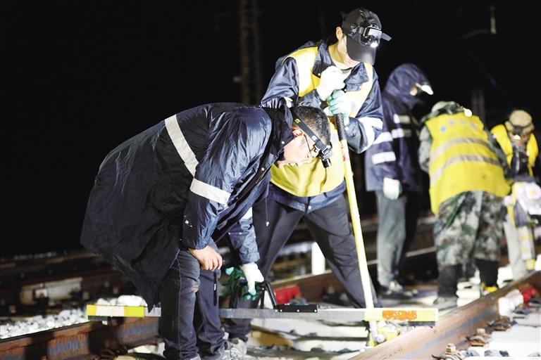 21時(shí)30分,作業(yè)中,暴雨傾盆而下,瞬間覆蓋了整個(gè)施工現(xiàn)場(chǎng),噼里啪啦地打在現(xiàn)場(chǎng)作業(yè)人員身上。早已經(jīng)歷過(guò)無(wú)數(shù)次風(fēng)雨洗禮的他們,握緊手中的工具,按照分工忙碌起來(lái),有的測(cè)量數(shù)據(jù)、有的配合作業(yè)、有的檢查設(shè)備、有的盯控安全……整個(gè)作業(yè)現(xiàn)場(chǎng)忙而有序,這場(chǎng)突降的暴風(fēng)雨,儼然已成為促使他們奮進(jìn)的鼓點(diǎn),他們正用昂揚(yáng)的斗志,奏響高原鐵路人的“天路夜曲”。