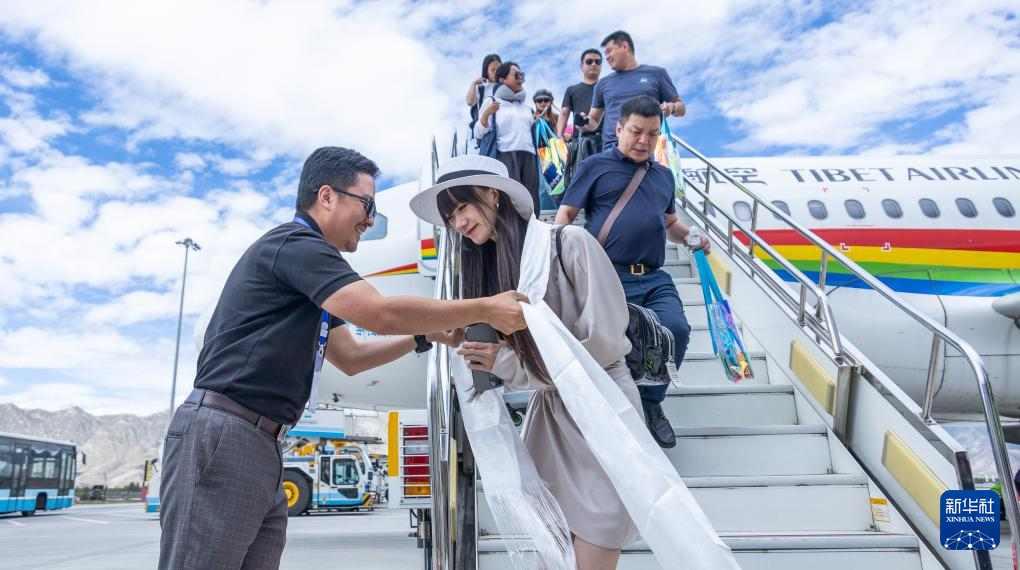 在西藏航空“地球第三極號(hào)”飛機(jī)首航儀式現(xiàn)場(chǎng),工作人員為游客獻(xiàn)上哈達(dá)(8月25日攝)。新華社發(fā)(丁增尼達(dá)攝)