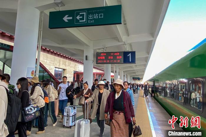 圖為8月30日暑運期間,旅客在西藏日喀則站乘坐高原復興號動車組出行。日喀則火車站 供圖