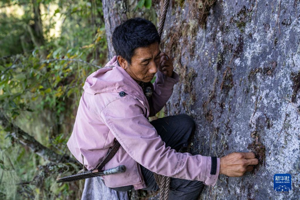 在西藏林芝市察隅縣下察隅鎮(zhèn)附近的密林中,一位“采山人”在崖壁上采集石耳(9月2日攝)。新華社記者 孫非 攝