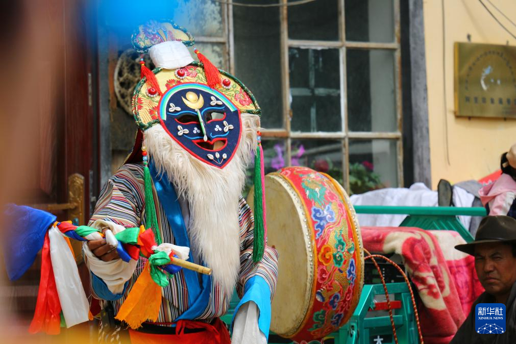 科迦藏戲團(tuán)團(tuán)長(zhǎng)達(dá)瓦洛珠正在表演藏戲(8月9日攝)。新華社記者 聶毅 攝