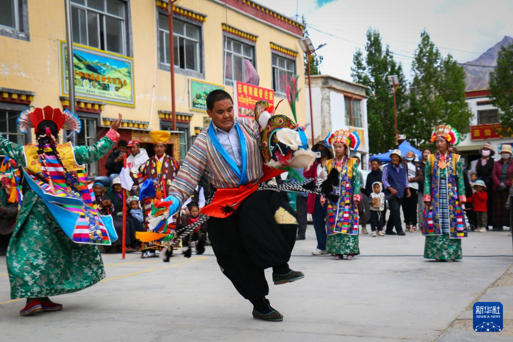 今年40歲的科迦藏戲團(tuán)團(tuán)長(zhǎng)達(dá)瓦洛珠帶領(lǐng)演員在村中心的科迦寺廣場(chǎng)上表演《諾桑法王》選段,獨(dú)具特色的唱腔和舞蹈絕活讓人拍案叫絕。