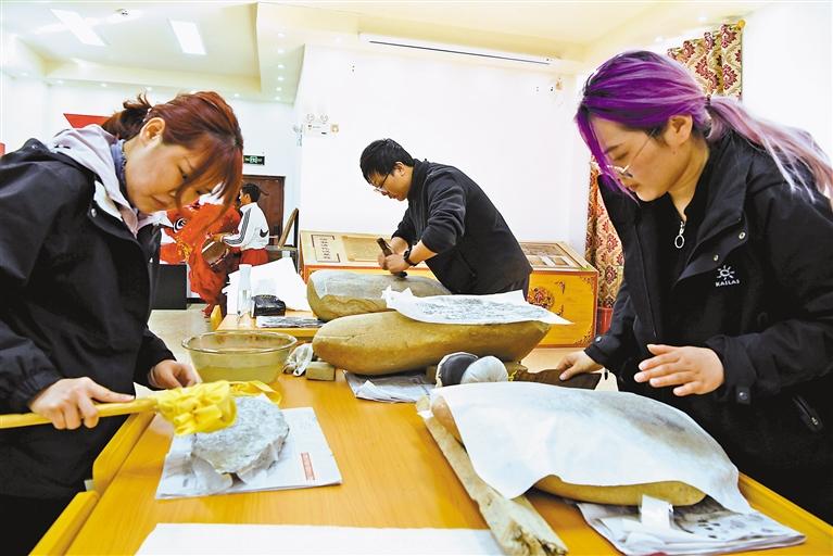 復(fù)旦大學(xué)圖書館中華古籍保護(hù)研究院師生在昌都市洛隆縣歷史文化陳列館內(nèi)拓印當(dāng)?shù)厥獭B迳?攝
