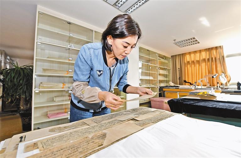 西藏自治區(qū)圖書館古籍保護(hù)中心工作人員在清理修復(fù)古籍。唐斌 攝