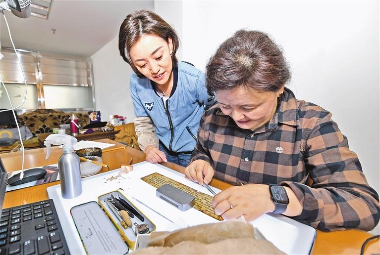 西藏自治區(qū)圖書館古籍保護(hù)中心工作人員在進(jìn)行古籍粘貼修復(fù)。唐斌 攝
