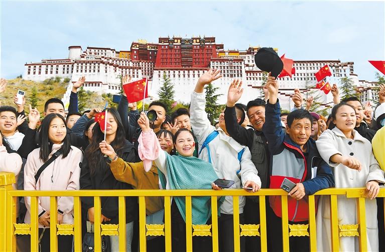10月1日上午,西藏自治區(qū)慶祝中華人民共和國成立74周年“升國旗、唱國歌”儀式在布達(dá)拉宮廣場舉行。圖為群眾在觀看升旗儀式。記者 次仁平措 攝