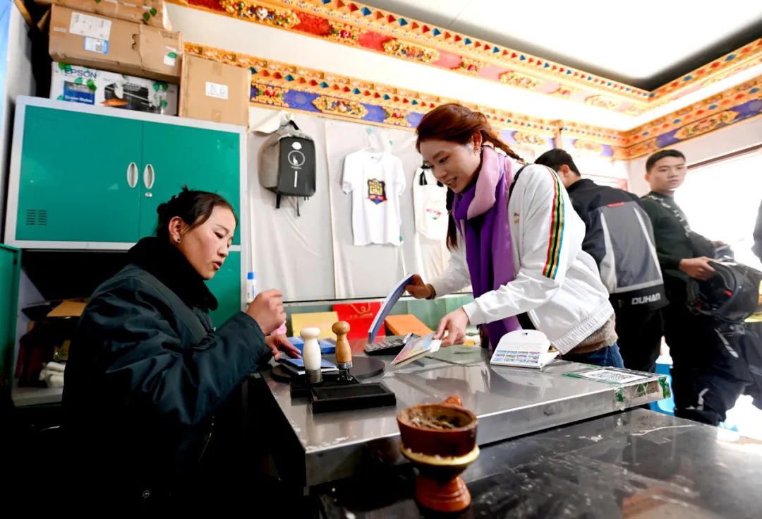 “看,這里是明信片書寫區(qū),那邊是郵品自選區(qū),再往里還有旅游紀(jì)念品銷售區(qū),我們還給游客提供了休息娛樂區(qū)……”扎西頓珠介紹說。