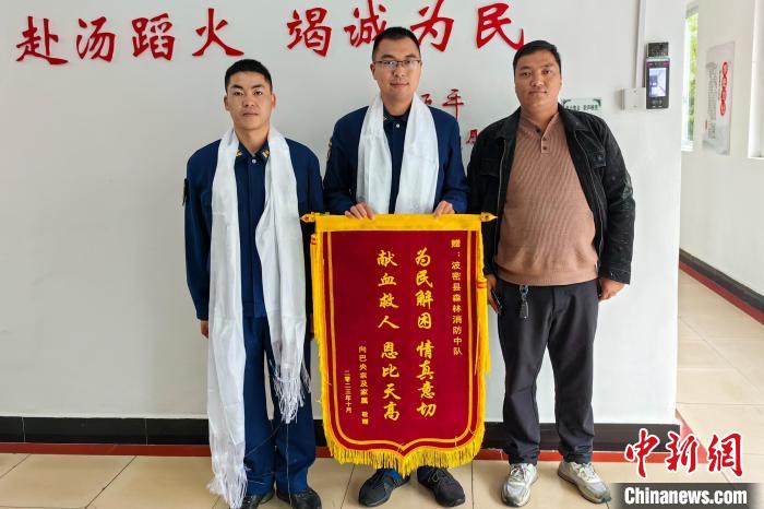 10月9日,為了感謝消防救援人員的緊急援助,被救助的孕婦家屬拿著一面“為民解困情真意切,獻血救人恩比天高”字樣的錦旗送到波密縣森林消防中隊。家屬不停地說著感謝,并說因為輸血及時,孕婦已經轉危為安了。