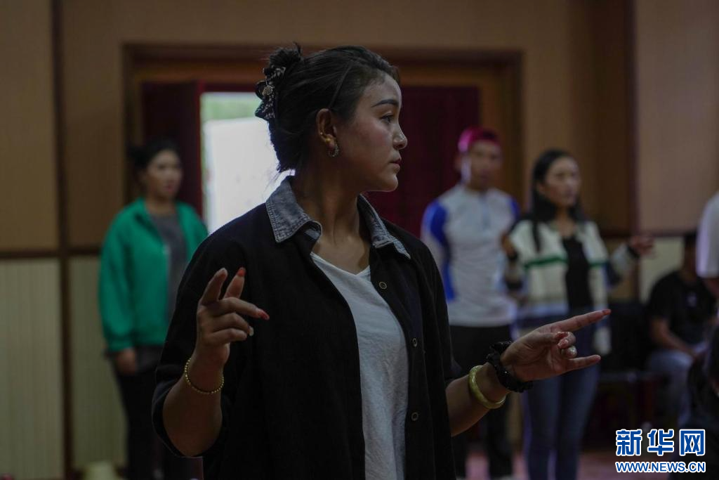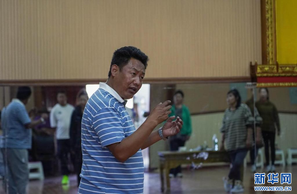 “像這樣,動(dòng)作幅度大一點(diǎn),我們?cè)賮硪淮?。”排練室里,西藏自治區(qū)級(jí)非物質(zhì)文化遺產(chǎn)傳承人、覺木隆藏戲傳承人洛桑扎西正糾正演員們的動(dòng)作,伴隨著有力的鼓點(diǎn),藏戲《白瑪文巴》的排練正在進(jìn)行。