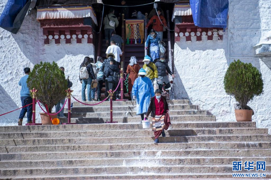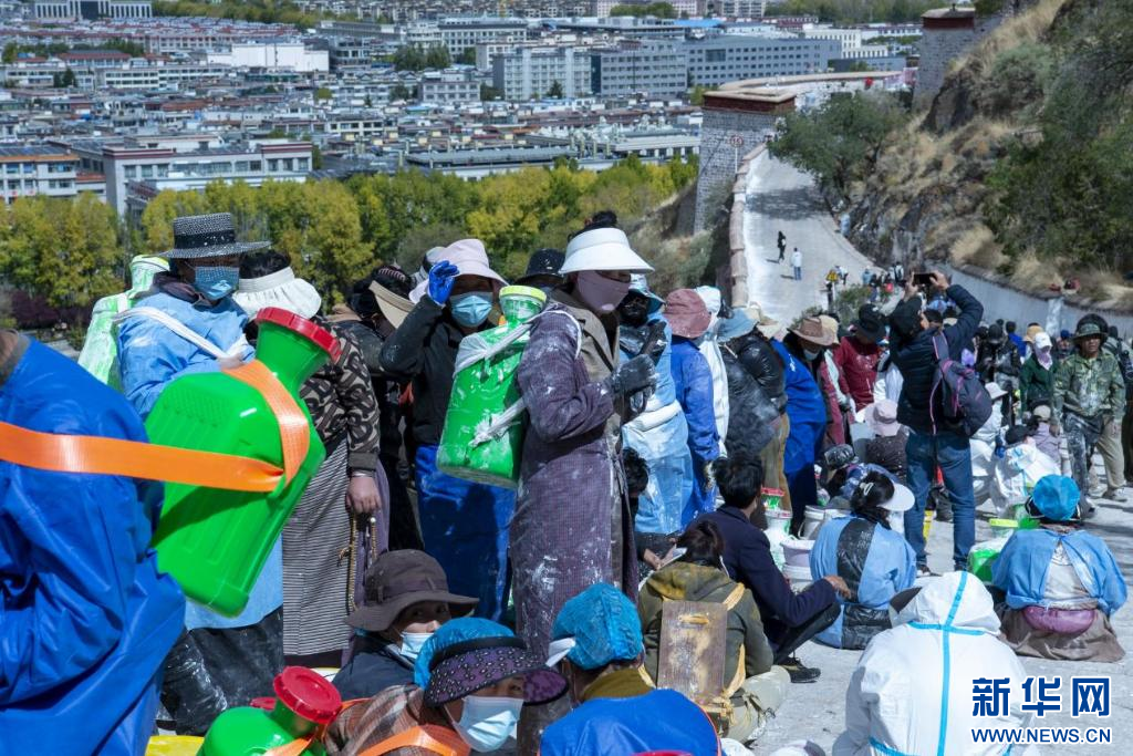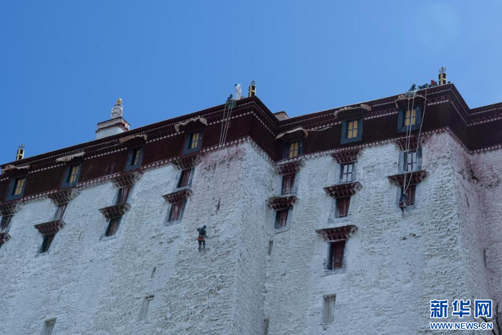 10月18日,布達(dá)拉宮“美容師”在噴灑涂料。新華網(wǎng) 柑丹鴦琦 攝