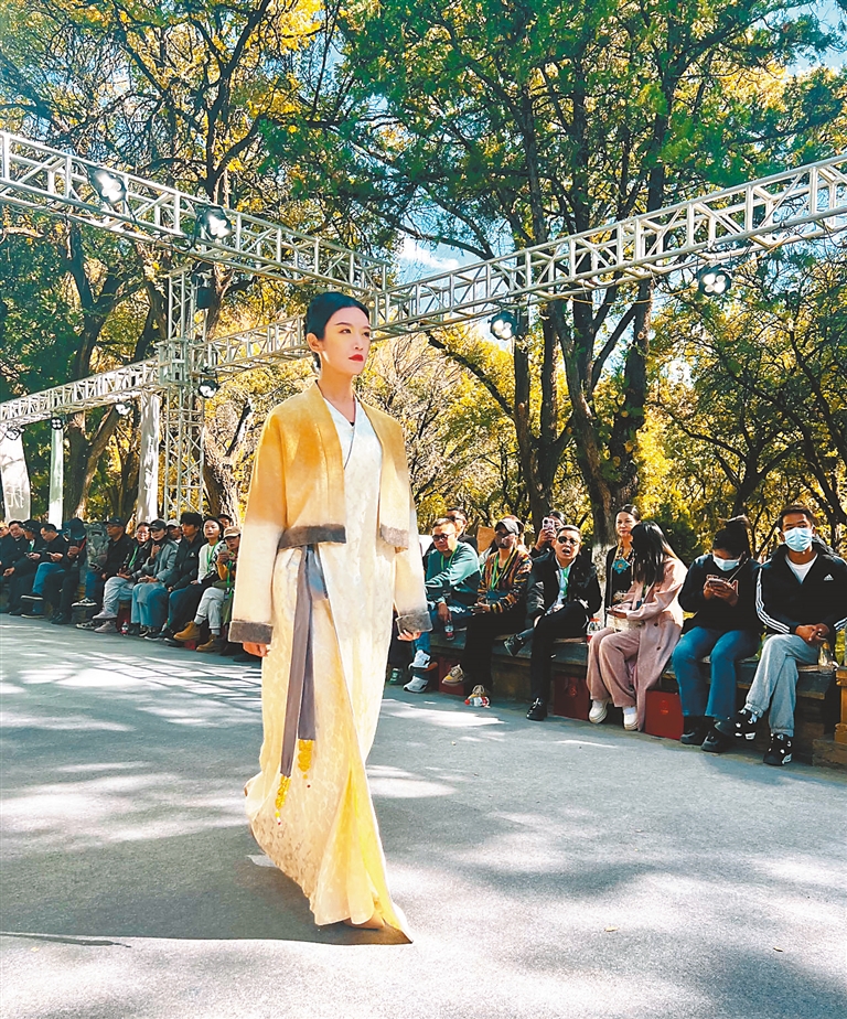 來自杭州的模特王添玉給記者介紹了他展示的“星落”系列,該系列在傳統(tǒng)日喀則服飾的基礎上增添了許多時尚元素,色彩、廓形、材質(zhì)和制作工藝方面都有創(chuàng)新,更受當下年輕人青睞。