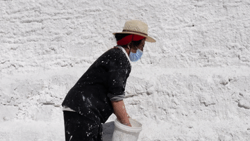 工作人員將牛奶、蜂蜜、藏紅花、白灰等材料按比例混合,經(jīng)過濾后對布宮墻體進行噴涂,這樣既可以保護建筑物表面不受腐化變質(zhì),也可更加美觀。