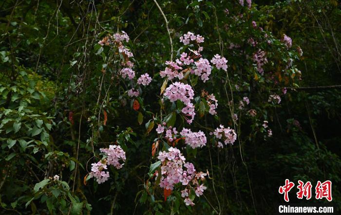 因氣候濕潤(rùn),森林里的樹上長(zhǎng)滿了藤蔓植物、蕨類植物、苔蘚。在這里,植物從空間上獲得了最大密度的生長(zhǎng)。開滿粉色花朵的植物從樹上倒掛而下,科考人員一眼辨認(rèn)出是大花水東哥,奈何正是花期無(wú)法采集種子。