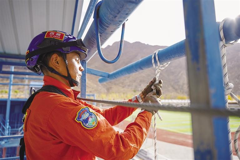 迅速打好繩結(jié)、扣好安全帶……27歲的仁增論珠身著全套戰(zhàn)訓服,正在進行繩索下降訓練。身姿矯健、動作干凈利落,眨眼間,他已安全降至地面。仁增論珠從小就有個當兵夢,2015年,他應征入伍,三年部隊生活錘煉了他的體能和意志。2019年,仁增論珠入職自治區(qū)森林消防總隊,成為一名消防戰(zhàn)士,繼續(xù)為保家衛(wèi)國貢獻自己的力量。