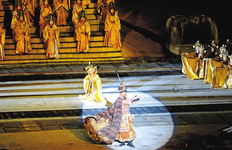 星空為幕,山川為景,金碧輝煌的宮殿出現在群山之中,在燈光照耀下熠熠生輝。在悠揚明朗的歌聲中,大劇拉開帷幕,藏族騎士自山中策馬而來,西風漫卷、彩旗飄揚;少女們和著旋律,翩翩起舞,文成公主與松贊干布的佳話重現在舞臺之上。