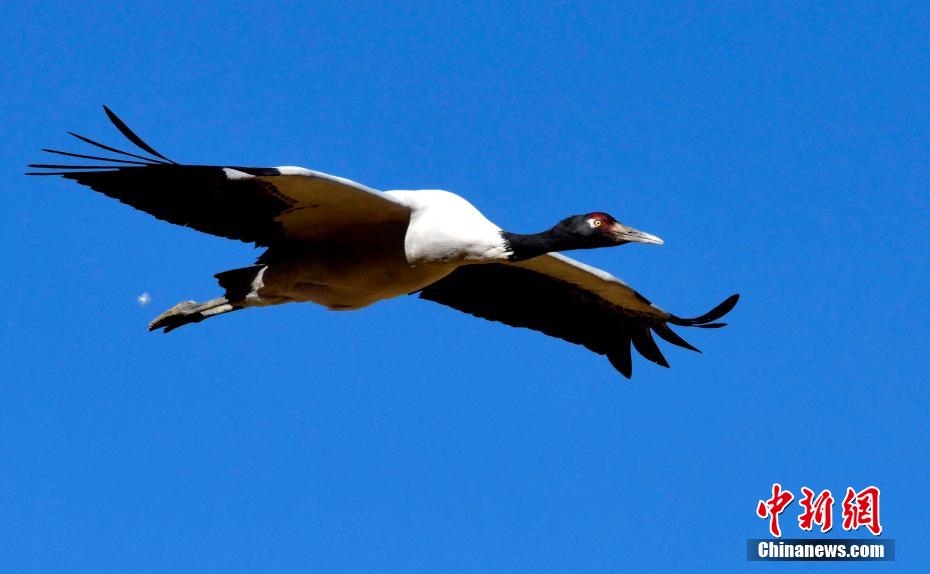 圖為11月21日,西藏日喀則市桑珠孜區(qū)邊雄鄉(xiāng)黑頸鶴振翅高飛。李林 攝