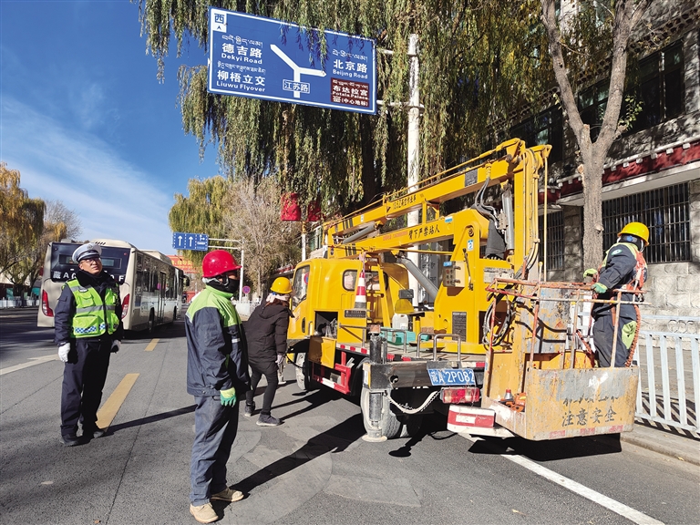 “結(jié)合拉薩市城鄉(xiāng)環(huán)境綜合大整治,我們?cè)陂_(kāi)展道路交通整治行動(dòng)中,積極聯(lián)合園林部門(mén)對(duì)于道路兩旁樹(shù)枝遮擋交通信號(hào)燈、指示標(biāo)牌和電子監(jiān)控探頭等問(wèn)題進(jìn)行全方位整改,此次整改點(diǎn)位155處,確保轄區(qū)道路交通安全暢通。在此,提醒廣大交通參與者,遇到修剪樹(shù)枝車(chē)輛,請(qǐng)減速慢行,確保交通安全。”拉薩市公安局交警支隊(duì)城南大隊(duì)副大隊(duì)長(zhǎng)張浩表示。