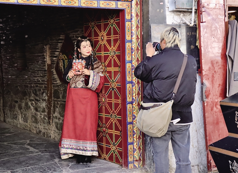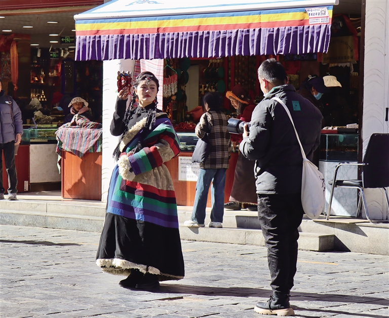 八廓街內(nèi)體驗藏裝寫真的游客。記者 張琳 攝