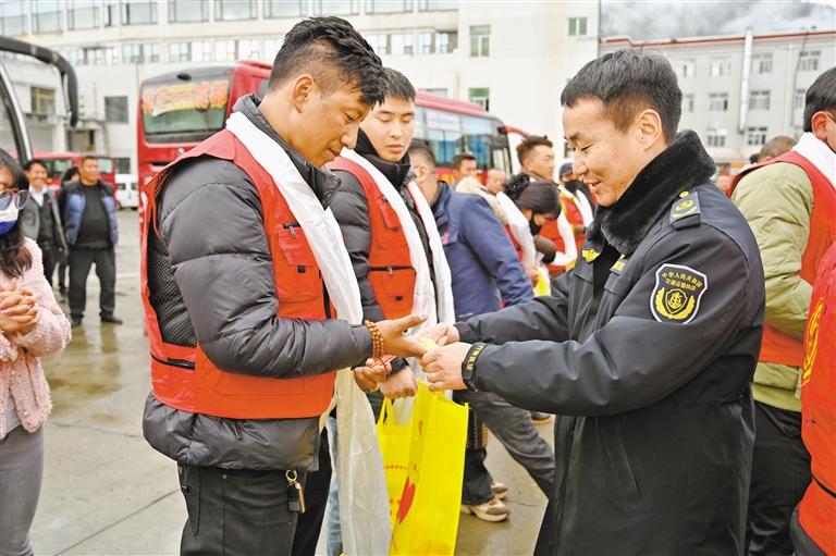 圖為啟動儀式現場,林芝市交通運輸局交通綜合行政執(zhí)法隊工作人員為返鄉(xiāng)農民工送上小禮品。西藏日報記者 謝筱純 攝