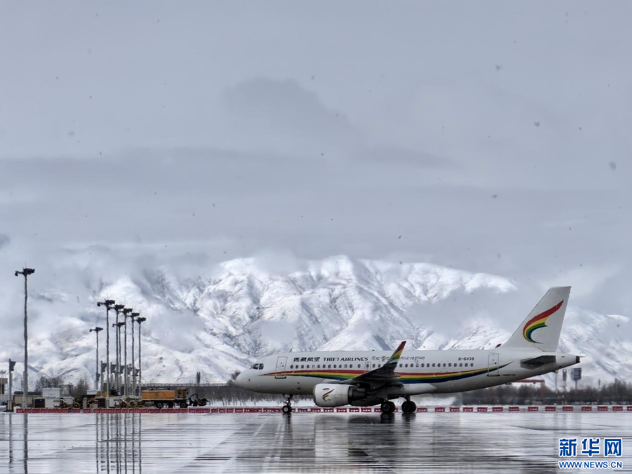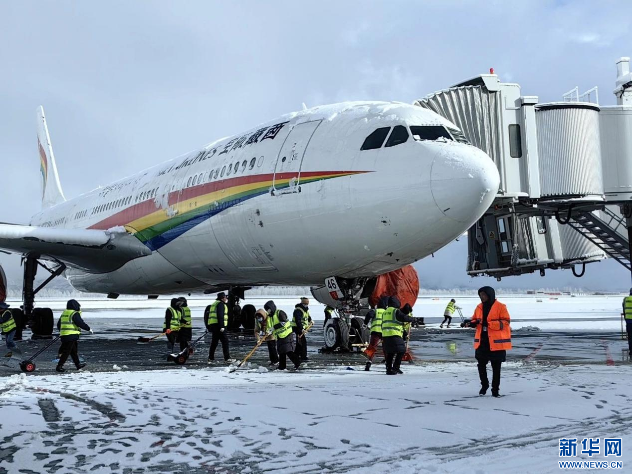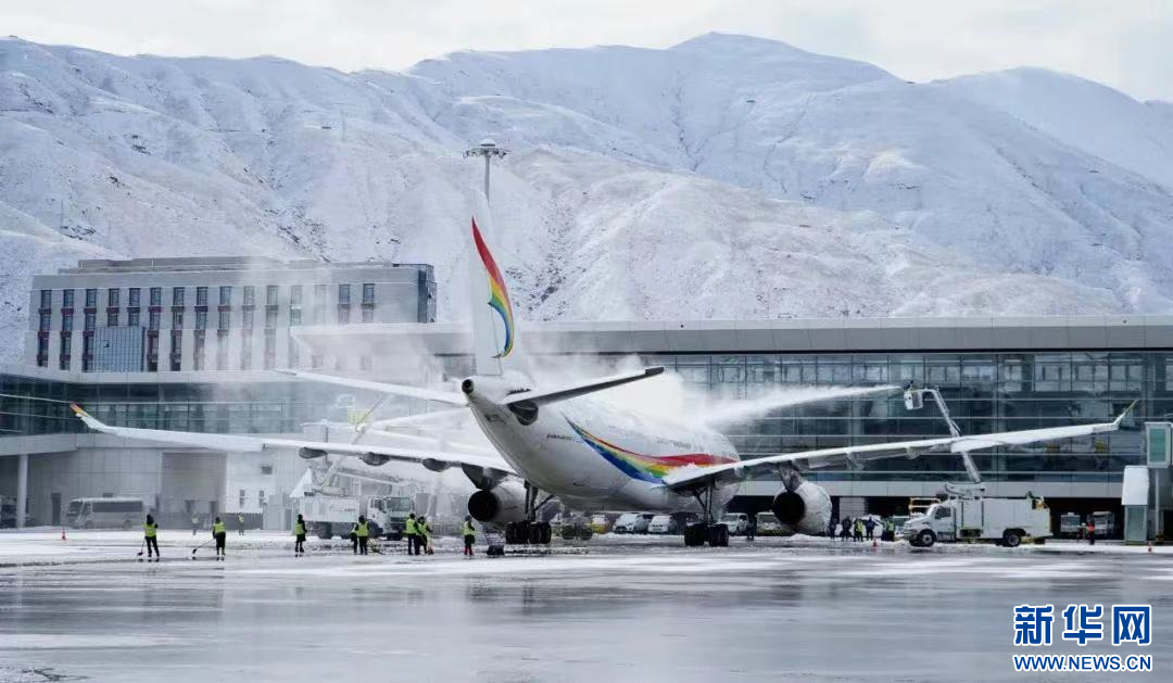 圖為拉薩貢嘎機(jī)場(chǎng)開(kāi)展航空器除冰雪工作。新華網(wǎng) 白瑪群宗 攝