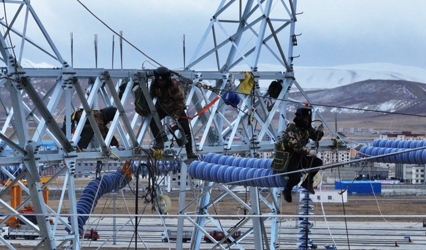 “還有10米,5米,導(dǎo)線到位!”12月12日,18時(shí),隨著對(duì)講機(jī)傳出的N5號(hào)塔位導(dǎo)線到位,標(biāo)志著海拔4600米的西藏自治區(qū)那曲市色尼區(qū)國(guó)能100兆瓦風(fēng)電110千伏送出工程全部貫通。