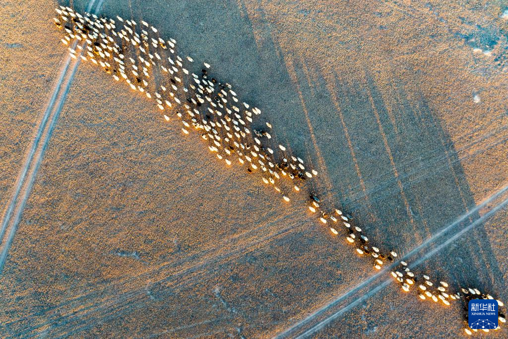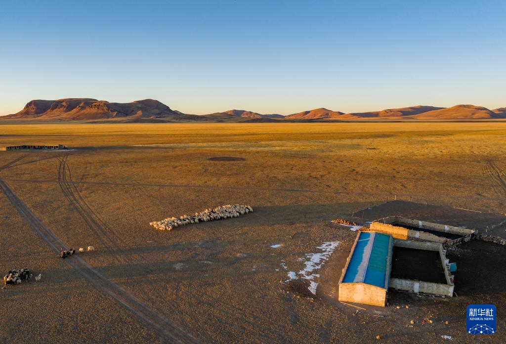 太陽落山,丹增家的羊從草場(chǎng)趕回棚圈(無人機(jī)照片,12月18日攝)。新華社發(fā)(旦增努布攝)
