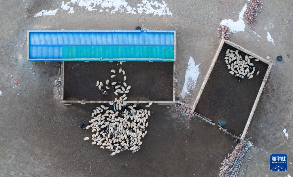 太陽落山,丹增家的羊回到棚圈。其中左側(cè)藍(lán)頂?shù)氖侨ツ晷律w的封閉式棚圈,右側(cè)是傳統(tǒng)的敞開式羊圈(無人機(jī)照片,12月18日攝)。新華社記者 姜帆 攝