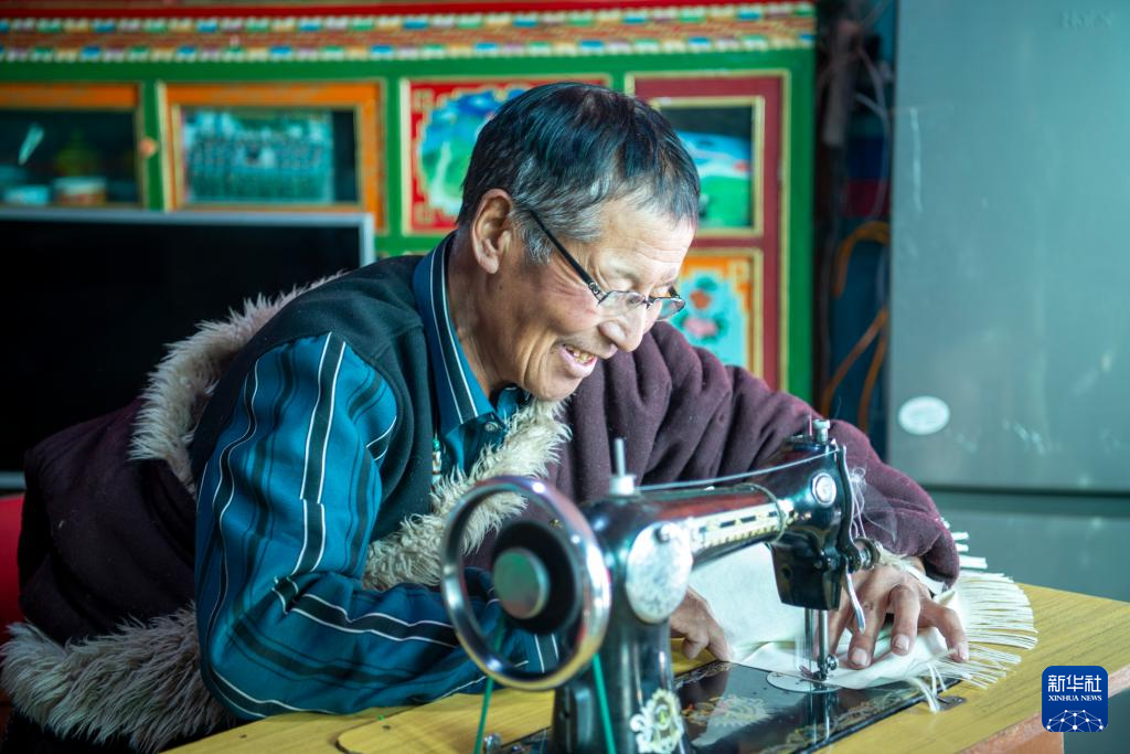 12月20日,古曲扎巴在家中免費幫村民縫制衣物。新華社發(fā)(旦增努布 攝)