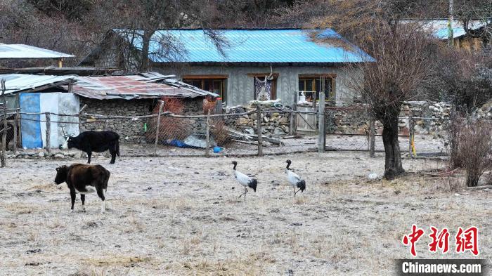 在西藏林芝市工布江達縣境內的巴松措景區(qū),越冬的黑頸鶴與周邊的農田、村莊融為一體,成為冬日里一道道靚麗的風景線。