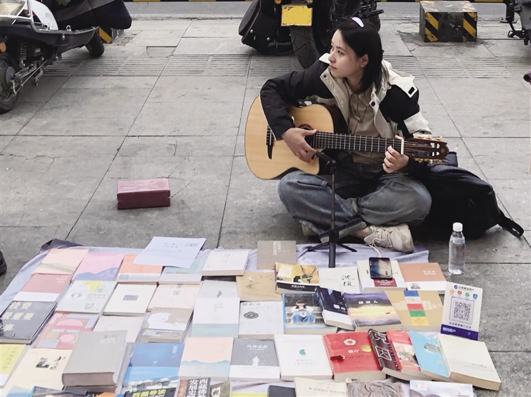 “覺得熱鬧、好玩,可以調(diào)劑工作生活帶來(lái)的壓力?!狈剿紳嵤菑慕衲?月份開始擺攤的,平時(shí)白天上班時(shí),她的活動(dòng)范圍局限于辦公室的“小格子間”;下班后,她便騎著自己的小電動(dòng)車,載著書籍、地?cái)偛己蛻敉獾?,支起屬于自己的小攤。在自己的攤位上,方思潔把書本整齊地排列在地?cái)偛忌希瑪[放好自己的小凳子,精心布置好燈光,便開始自己的擺攤生活。